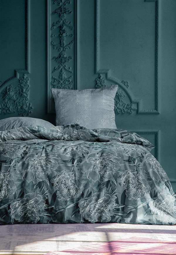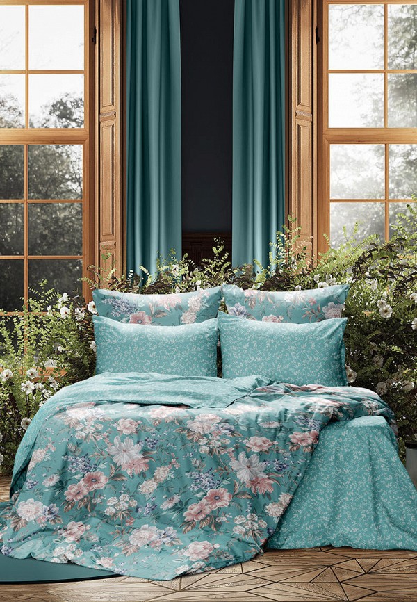 Постельное белье Евро Mia Cara, Перкаль, 4 нав. (50х70-2шт; 70х70-2шт), на резинке, Чарующий сад, пастельно-бирюзовый