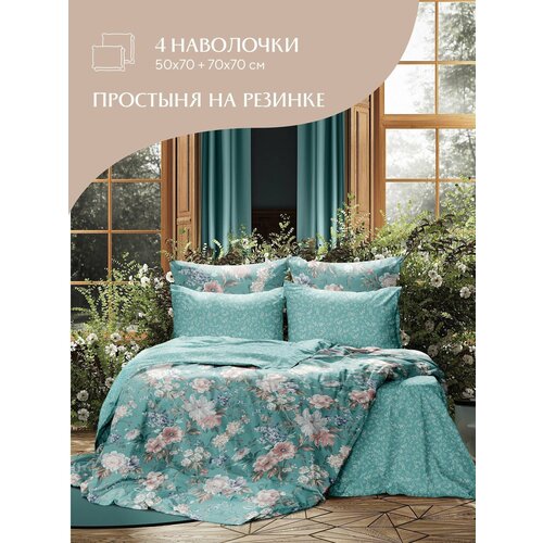 Комплект постельного белья Mia Cara Евро, Перкаль, Хлопок, 4 наволочки 50х70; 70х70, с простыней на резинке / Чарующий сад 36018-5/36019-1