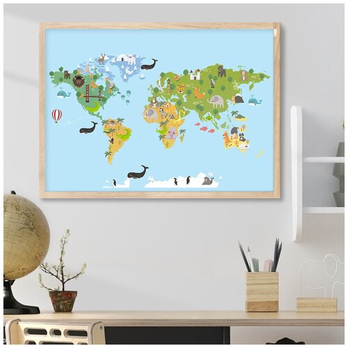 Постер без рамки "Карта мира с животными для детей" 40 на 50 в тубусе / Картина для интерьера / Плакат / Постер на стену