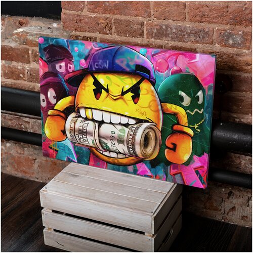 Картина мотивация на холсте "Успешный и суровый Pac-Man" для интерьера дома, офиса, в гостиную, в прихожую граффити / Пак ман с деньгами, смайлик