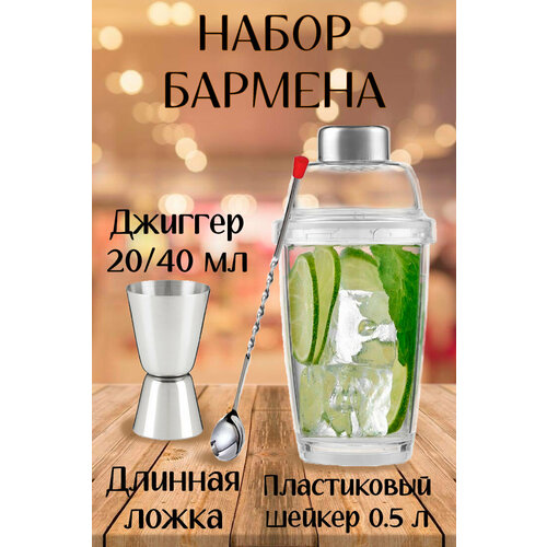 Набор бармена: пластиковый шейкер 0.5, джиггер, коктейльная ложка