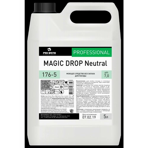 Моющее средство без запаха для посуды Pro-Bright Magic Drop Neutral 176-5 5 л Назначение: для мойки посуды и столовых приборов, уст...