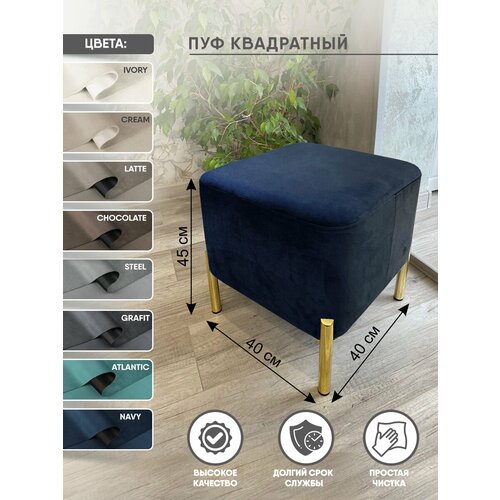 navyМягкий, дизайнерский пуфик является ярким украшением современного интерьера. В обивке используются высококачественные материалы , которые не деформируются при многократной ежедневной эксплуатации. Красивые металлические опоры имеют пластиковые накладки, которые защитят ваш пол от зарапин и лишнего шума при передвижении. Квадратный пуфик легкий и компактный наполняет уютом пространство , его скромные размеры позволяют разместить его в любой комнате : прихожей, кухне, спальне, детской, гостинной, гардеробной и даже балконе. Так же пуф станет отличным подарком близкому человеку, на годовщину, памятную дату, любой праздник. Пуф хорошо упакован в защитную пленку и картонную коробку. Мы стараемся что бы Вы остались довольны, приятных покупок!