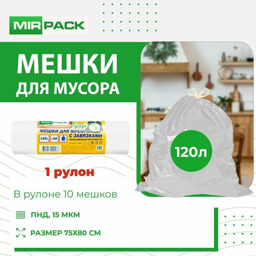 "VIP" с завязками 120 литров, в рулоне 10 штук, ПНД, 15 мкм, размер 75*80 см, белые, 1рулон