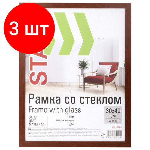 Комплект 3 шт, Рамка 30х40 см "итальянский орех" STAFF "Grand", багет 18 мм, стекло, МДФ, 391198