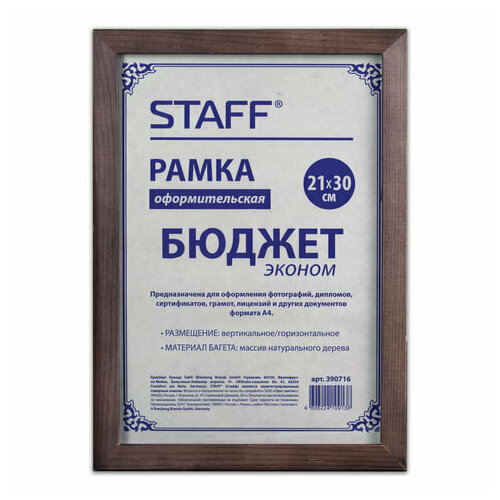 Рамка 21х30 см, дерево, багет 17 мм, STAFF, мокко, стекло, 391140 упаковка 5 шт.