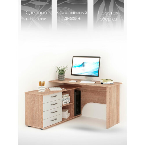 Стол письменный компьютерный угловой Гарвард левый с выдвижными ящиками, белый/дуб сонома