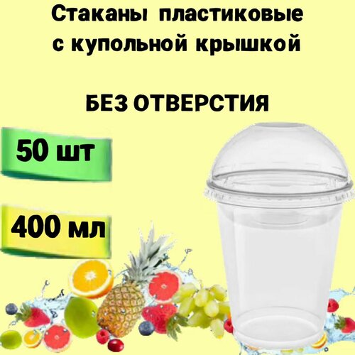 Стаканы одноразовые пластиковые с купольной крышкой без отверстия, 400мл 50шт, для коктейлей, десертов, смузи