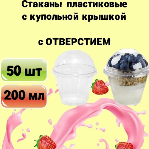 Стаканы одноразовые пластиковые с купольной крышкой с отверстием, 200мл 50шт, для коктейлей, десертов, смузи