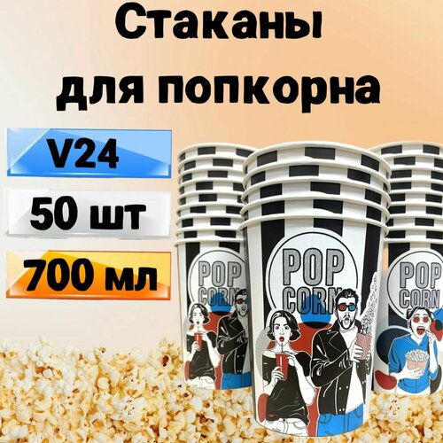 Стакан для попкорна бумажный V24, 700мл, 50 шт, Премьерный стакан для попкорна с рисунком