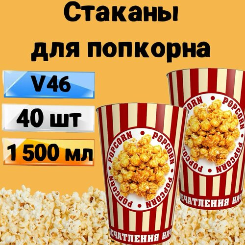 Стакан для попкорна бумажный V46, 1.5 л, 40 шт, Стаканы одноразовые для попкорна и снеков Классика