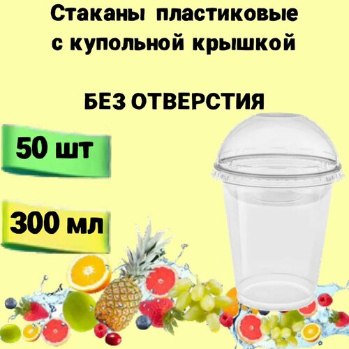 Стаканы одноразовые пластиковые с купольной крышкой без отверстия, 300мл 50шт, для коктейлей, десертов, смузи