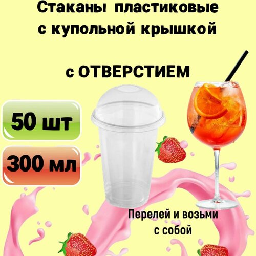 Стаканы одноразовые пластиковые с купольной крышкой с отверстием, 300мл 50шт, для коктейлей, десертов, смузи