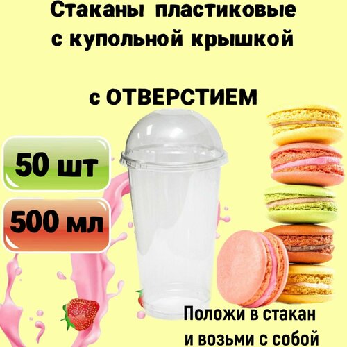 Стаканы одноразовые пластиковые с купольной крышкой с отверстием, 500мл 50шт, для коктейлей, десертов, смузи