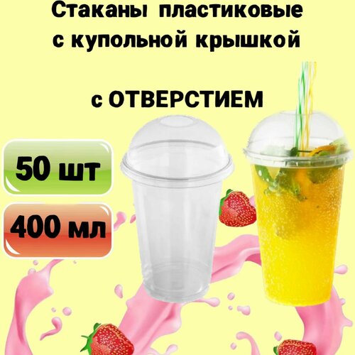 Стаканы одноразовые пластиковые с купольной крышкой с отверстием, 400мл 50шт, для коктейлей, десертов, смузи