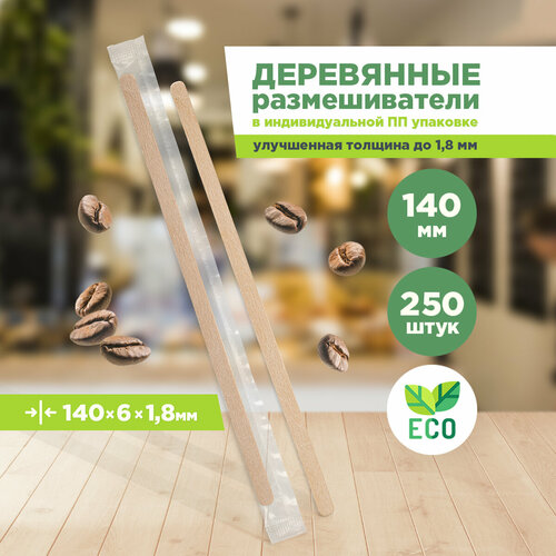 Размешиватели для напитков, деревянные, в индивидуальной ПП упаковке, 140 х 6 х 1,8 мм, 250 шт/уп, AVIORA (401-272)