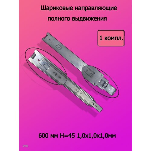 Шариковые направляющие для мебели полного выдвижения для ящиков, длина 500 мм, без доводчика, комплект на один ящик 2 шт, до 20 кг