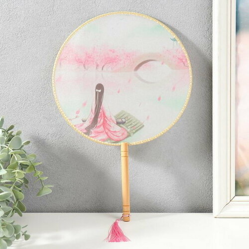 Веер круглый дерево, текстиль "Девушка на плоту" с кисточкой 33х21.5 см