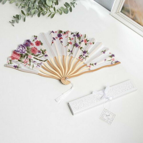 Веер бамбук, текстиль h=21 см изгиб, с кистью "Цветы" в коробке