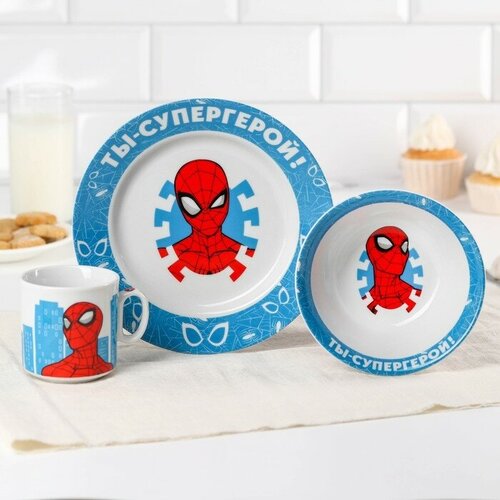 MARVEL Набор посуды «Ты - супергерой», 3 предмета: тарелка Ø 16,5 см, миска Ø 14 см, кружка 250 мл, Человек-паук