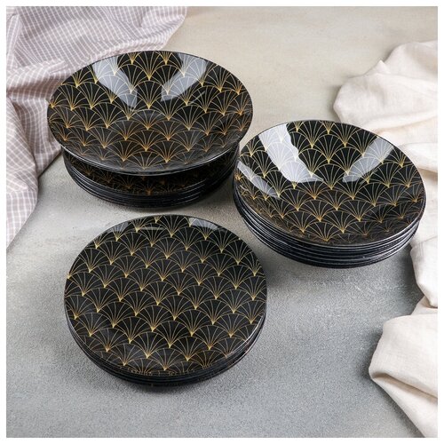 Набор тарелок стеклянных Доляна «Золотое перо», 19 предметов: салатник, 6 десертных тарелок, 6 обеденных тарелок, 6 мисок, цвет чёрный