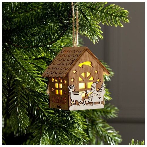 Ёлочная игрушка «Домик с Дедом Морозом на санках», от батареек, свечение тёплое белое