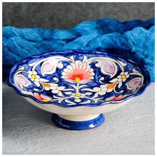 Шафран Конфетница Риштанская Керамика "Цветы", 14 см, синяя