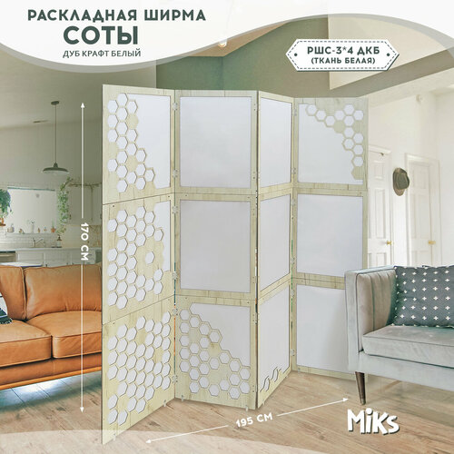 РШС-3*4 ДКБ Ткань белая Соты Ширма перегородка складная напольная MiKs для зонирования комнаты, салона красоты, офиса, кафе, дома, гостиной и детской, интерьерная
