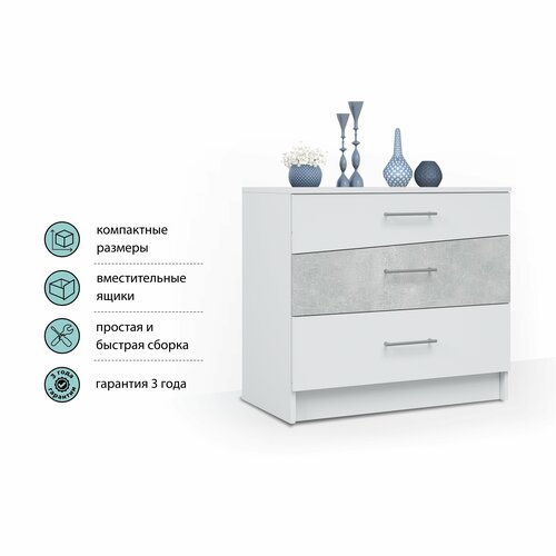 Комод Антария 3 ящика белый ателье светлый с ручками тумба в комнату, гостиную, зал, спальню, прихожую, для дома, дачи, белья, игрушек (45х80см)