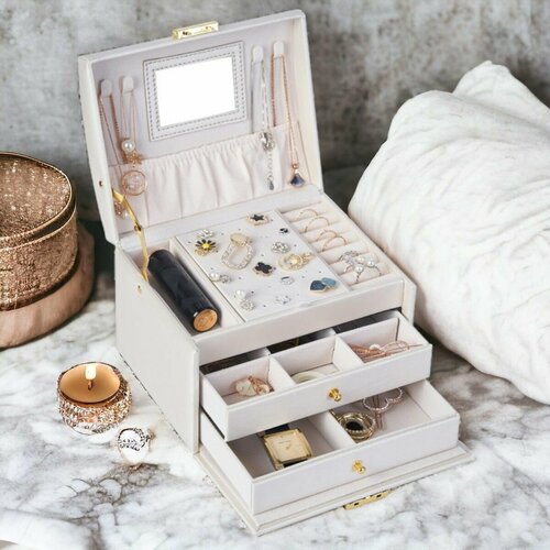 Шкатулка для украшений Агата 2 с зеркалом и замком, белого цвета, искусственная кожа