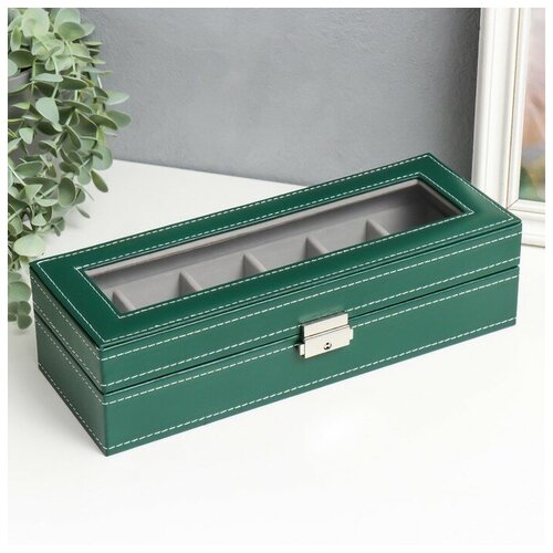 Шкатулка кожзам под часы 6 отделений "Зелёная с белой строчкой" 8х30х11 см