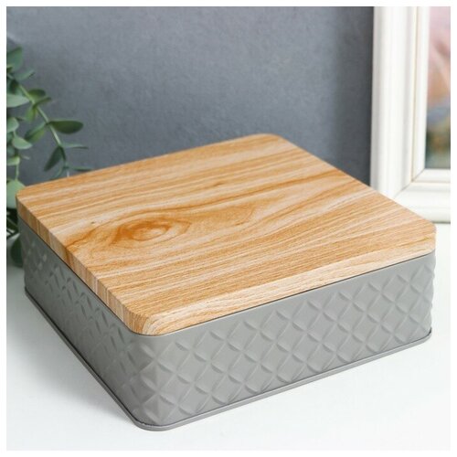 Шкатулка металл квадрат "Ромбы" серая, крышка под дерево 6х17х17 см