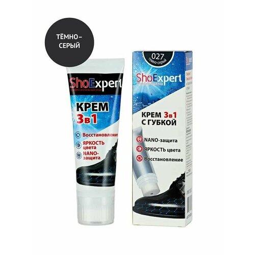 Крем для обуви ShoExpert (Темно-серый) с губкой для гладкой кожи, 75 мл