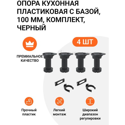 Опора кухонная пластиковая с базой, черная, 100 мм (комплект: ножка - 4 шт, клипса для цоколя - 2 шт)