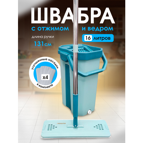Умная швабра с отжимом и ведром для мытья пола. Сменные насадки для швабры 4 шт. Ведро 16 литров