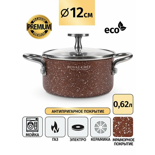 Кастрюля c крышкой Royalty Chef коричневая. Объем 0,62 литра. Антипригарное покрытие, стеклянная крышка, материал алюминий. Диаметр 12 см.