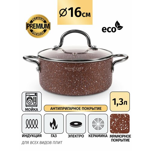Кастрюля c крышкой Royalty Chef коричневая. Объем 1,31 литра. Антипригарное покрытие, стеклянная крышка, материал алюминий. Диаметр 16 см.