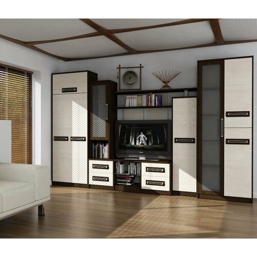 ТВ выполнена в цветовом сочетании «дуб млечный/венге», которое пользуется большой популярностью. Торцы ТВ и полки цвета «венге», что визуально облегчает стенку. Дверца пенала и нижние ящики в цвете «