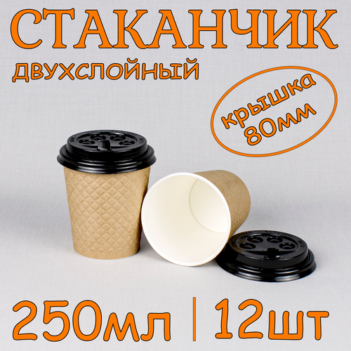 Стакан бумажный двухслойный крафтовый 250 мл с крышкой, 12 шт