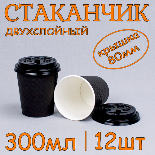 Стакан бумажный двухслойный 300 мл с крышкой, 12 шт