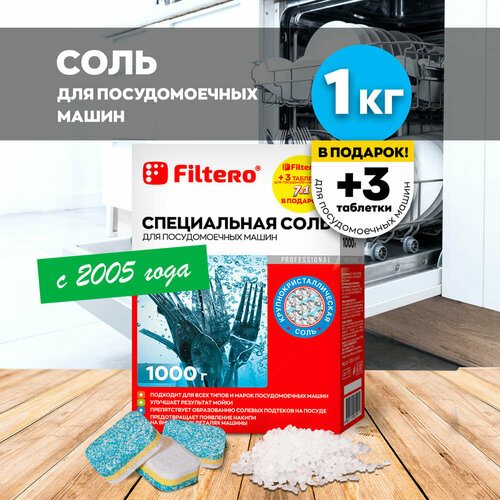Соль крупнокристаллическая Filtero для посудомоечных машин + 3 таблетки "7 в 1" для ПМ