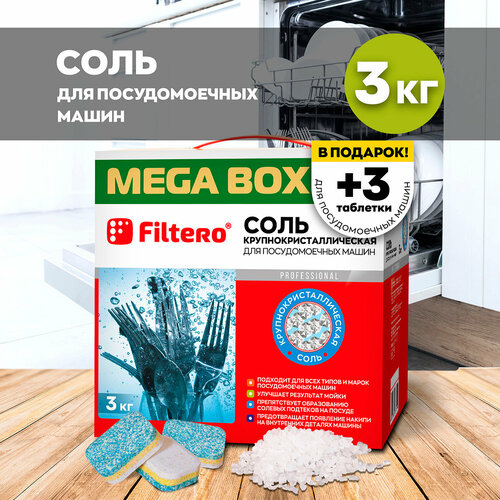 Соль крупнокристаллическая Filtero для посудомоечных машин, 3кг + 3 таблетки "7 в 1" для ПММ