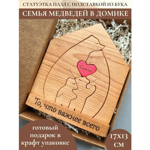Декоративная статуэтка для интерьера в виде Семьи Медведей - станет настоящим символом Вашей семьи. Фигурки животных изготовлены из прочной древесины бука и пропитаны натуральным льняным маслом для детских игрушек. Наши сувениры из дерева - это ручная работа, каждая фигурка тщательно отшлифована и приятна на ощупь. Размер статуэтки 13х16,5 см, толщина 2 см, что позволяет фигуркам устойчиво стоять на ровной поверхности. Интерьерная статуэтка - универсальный и запоминающийся подарок на любой праздник. Декоративная фигурка упакована в коробочку с бумажным наполнителем. Также просим учитывать, что каждая фигурка индивидуальна из-за уникальной структуры дерева и может отличаться по рисунку древесины и оттенку. Изготовлено в России. Ручная работа и теплота рук мастеров не оставят Вас равнодушными. Статуэтку для интерьера Семья медведей Вы можете дополнить подставкой из дерева. К фигурке пазл Медведи подойдут подставки с артикулом 106545549, 06545463, 142928176.