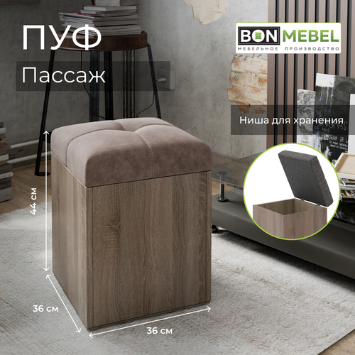 Пуфик BONMEBEL Пассаж, сонома-трюфель,/латте, 36х44х36 см, пуф с ящиком для хранения, пуфик для прихожей, пуф