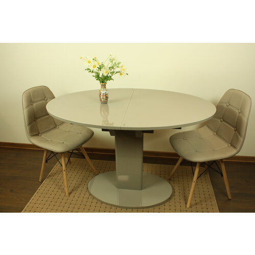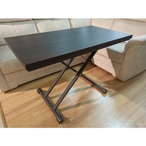 Столешница выполнена из закаленного окрашенного стекла черного цвета. В разложенном виде — столешница круглой формы, диаметром 120 см. При вращении столешницы боковые сектора либо фиксируются в верхнем состоянии, либо опускаются вниз и фиксируются под столешницей на магнитах. В сложенном виде ширина столешницы — 76 см. Ноги выполнены в виде стальных труб, окрашенные черной краской. Движение вверх-вниз происходит с помощью газлифта, возможна фиксация на любой высоте от 43 до 76 см. На ножках — 4 ролика (2 со стопорами).