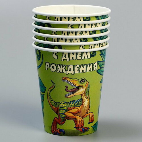 Стакан бумажный "С днём рождения! Динозавр", 250 мл, в наборе 6 шт.