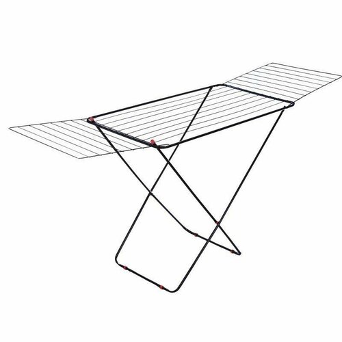 Все углы сушилки плавно скруглены. Цвет краски: серебристый металлик. Пластик: красный. Максимальная нагрузка на сушильную поверхность - 12кг. Пластиковые наконечники на ножках сохранят пол от царапин и потертостей. Сушилка легко складывается и раскладывается, и занимает мало места при хранении. Сделано в России. Вес - 1,65кг. Сушилка в сложенном виде 114х39х2,5см. Высота в рабочем положении 87см. Механизм раскладывания — слайдер (скольжение). Опоры — 12х0,6мм. Рама — Проволока 4мм. Крылья — Проволока 4мм. Прутки — 2,5мм