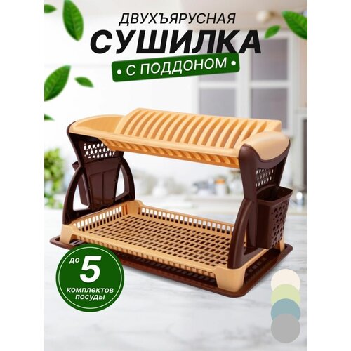 Сушилка для посуды двухъярусная , с поддоном , цвет-коричневый