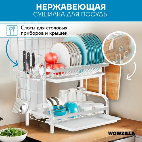 Сушилка для посуды настольная с отводом воды Gitka от Wowzilla двухуровневая с антикоррозийным покрытием белый