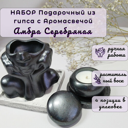"Амбра серебряная ", Набор подарочный с Ароматической свечой в гипсовом подсвечнике
